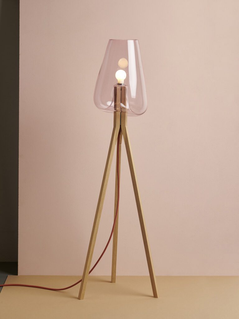 The typology of the lamp is defined by an unusual connection between glass and stand. It is created directly during the manufacturing process of the hot mouthblown glass.