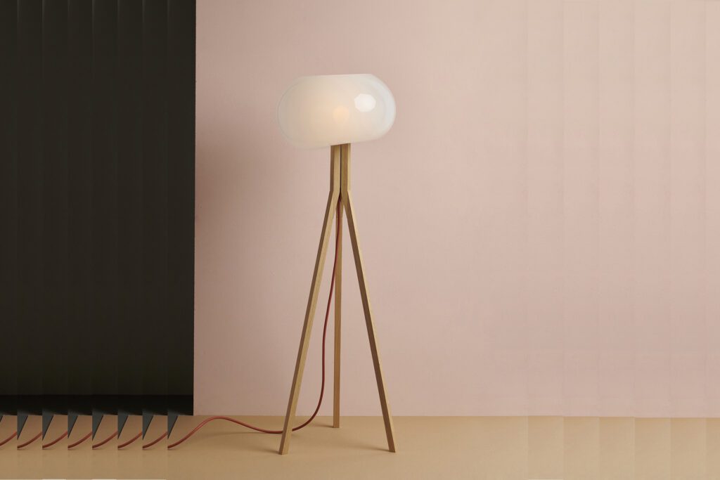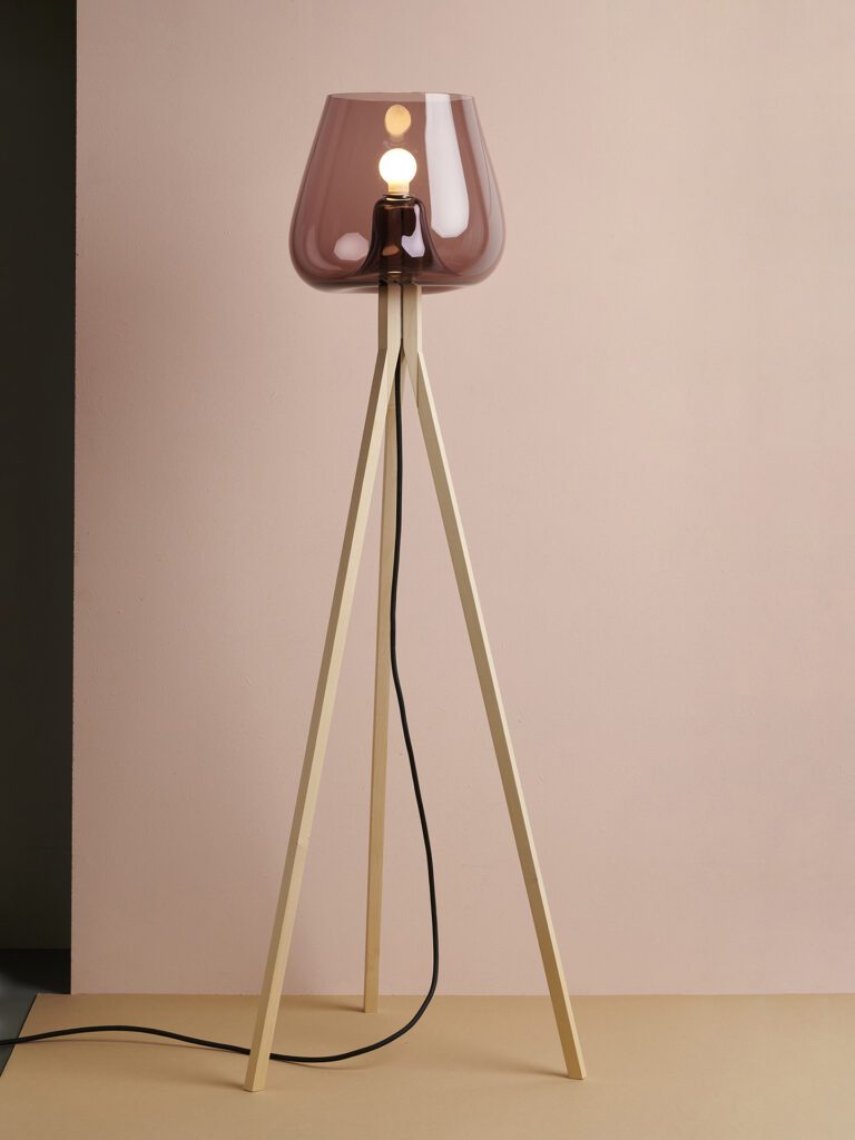 About the tool of the production process becoming component of the product: The design of the floor lamp Add.on is a combination between a free-blown glass body and a serial crude oak stand. The connection between the two parts is created in the manufacturing process, in which the glass bubble is blown directly onto the stand and the outline of the stand is formed inside of the glass. Therefore, the stand serves not only as a functional part but also as tool to produce the lamp shade. The result is an optimal fit between stand and vitreous. The three individual legs are fixed together by the glassbody and hold by an aluminum tube. The concept of the production process of the floor lamp Add.on makes each floor lamp to a unique piece. It creates a connection between the reduced wood stand and a highly individual and organic form, which arises from a process in which the possibility of precise planning and reproduction defies. The floor lamps are both: product as well as object referring to an underlying production process.