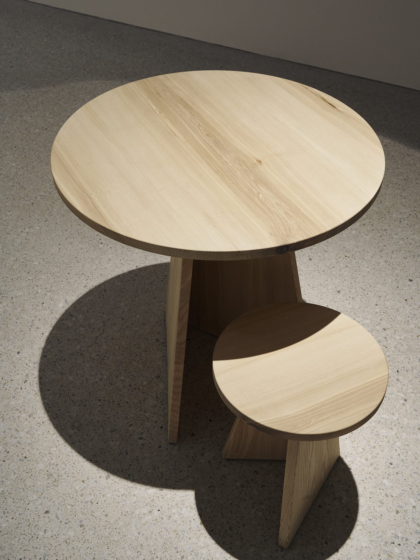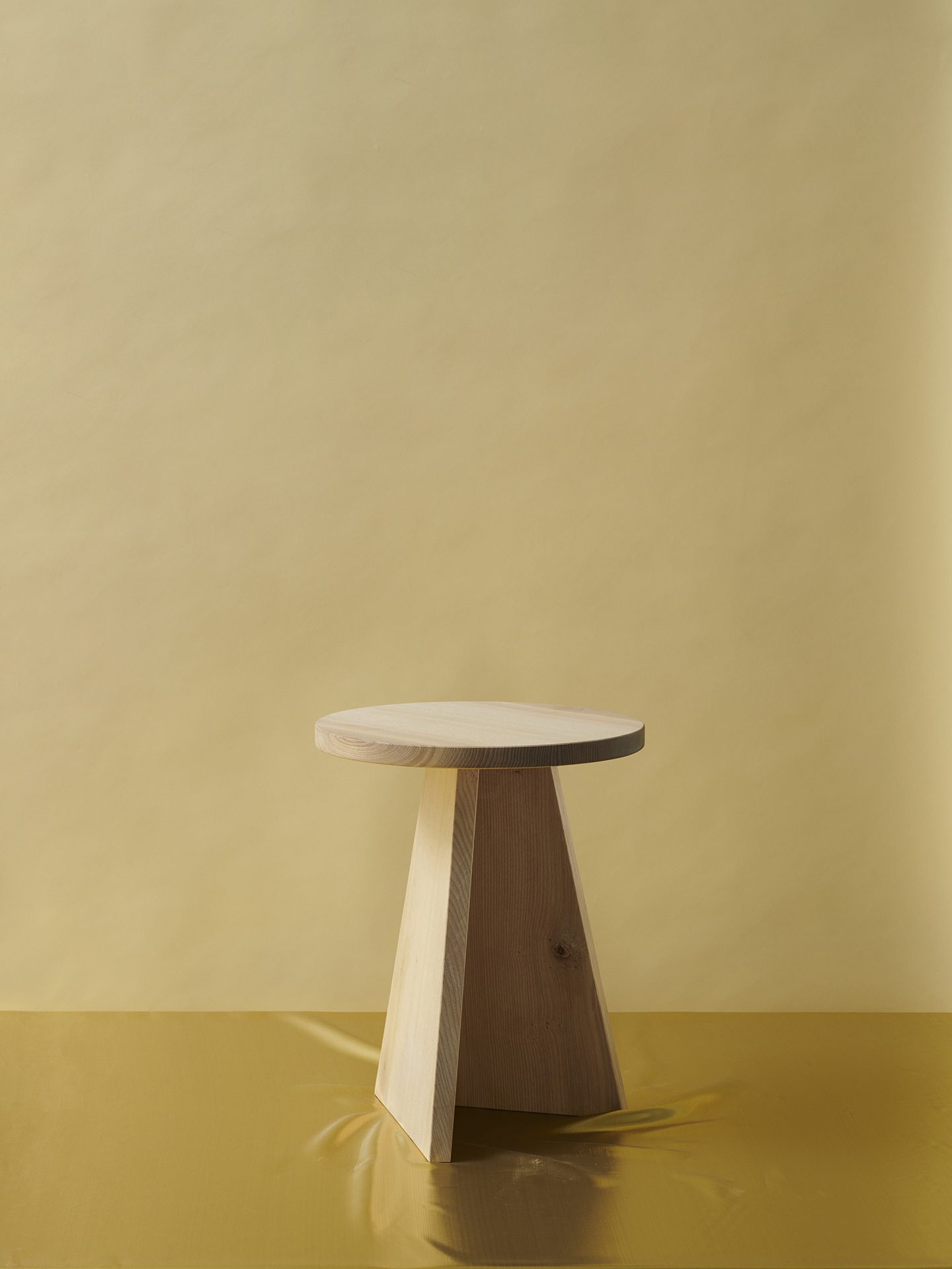 Tisch und Hocker der Serie „Every Page“ sind aus massivem Eschenholz gefertigt und gehen auf eine Auseinandersetzung mit den grundlegenden geometrischen Formen zurück: Kreis und Dreieck bzw. Tetraeder treffen hier aufeinander. Je nach Blickwinkel ändert sich die Geometrie der Objekte. Durch die einseitige Öffnung lassen sich Tisch und Hocker ineinander schieben. Die Serie wurde im Zusammenhang mit der Ausstellung „My Name Was Written On Every Page“ für die Grimmwelt Kassel entworfen.