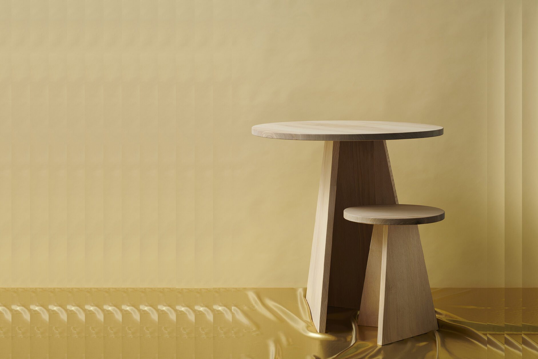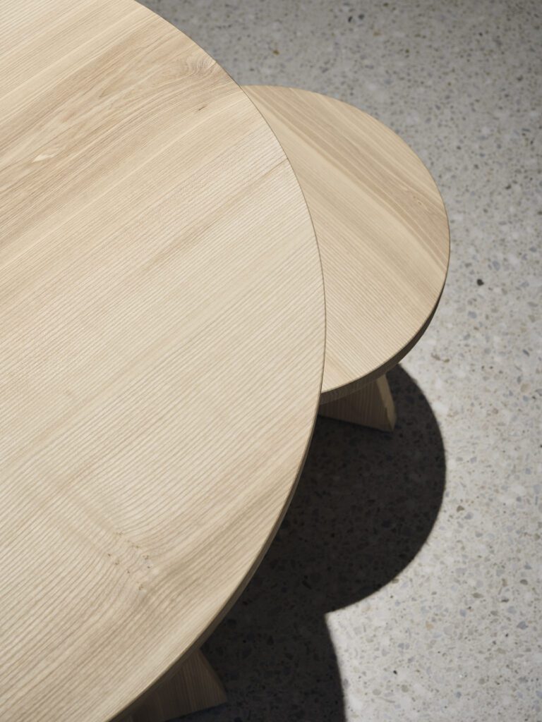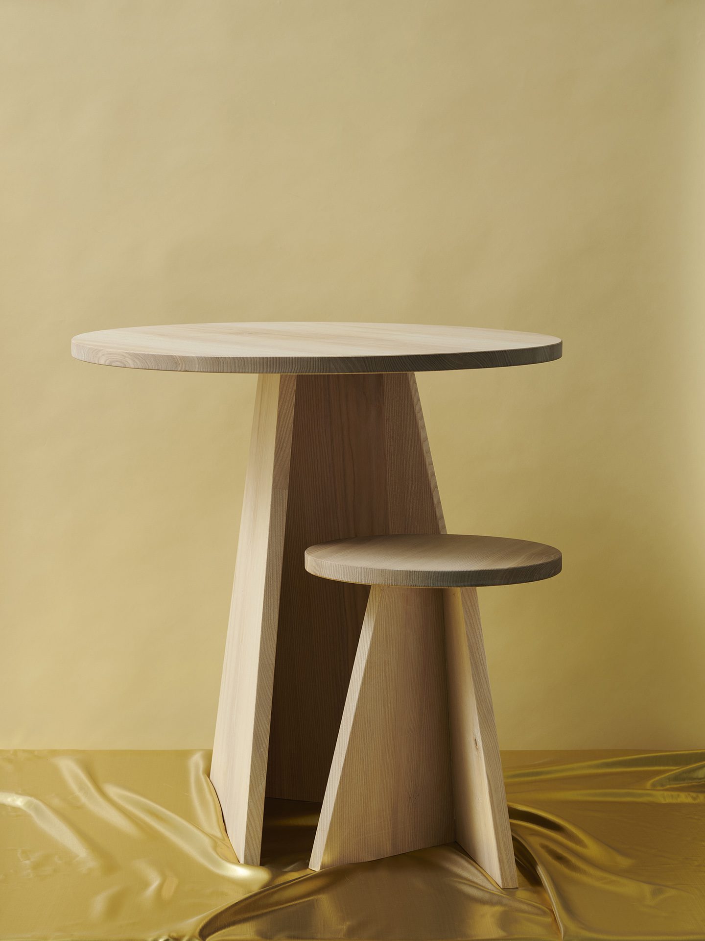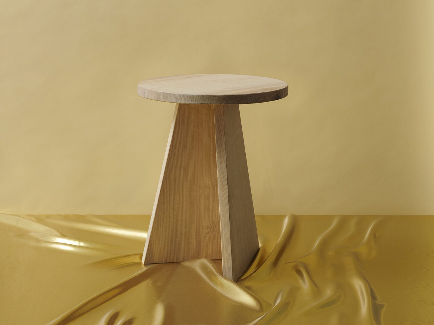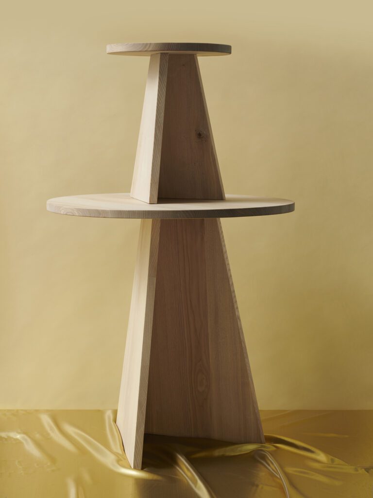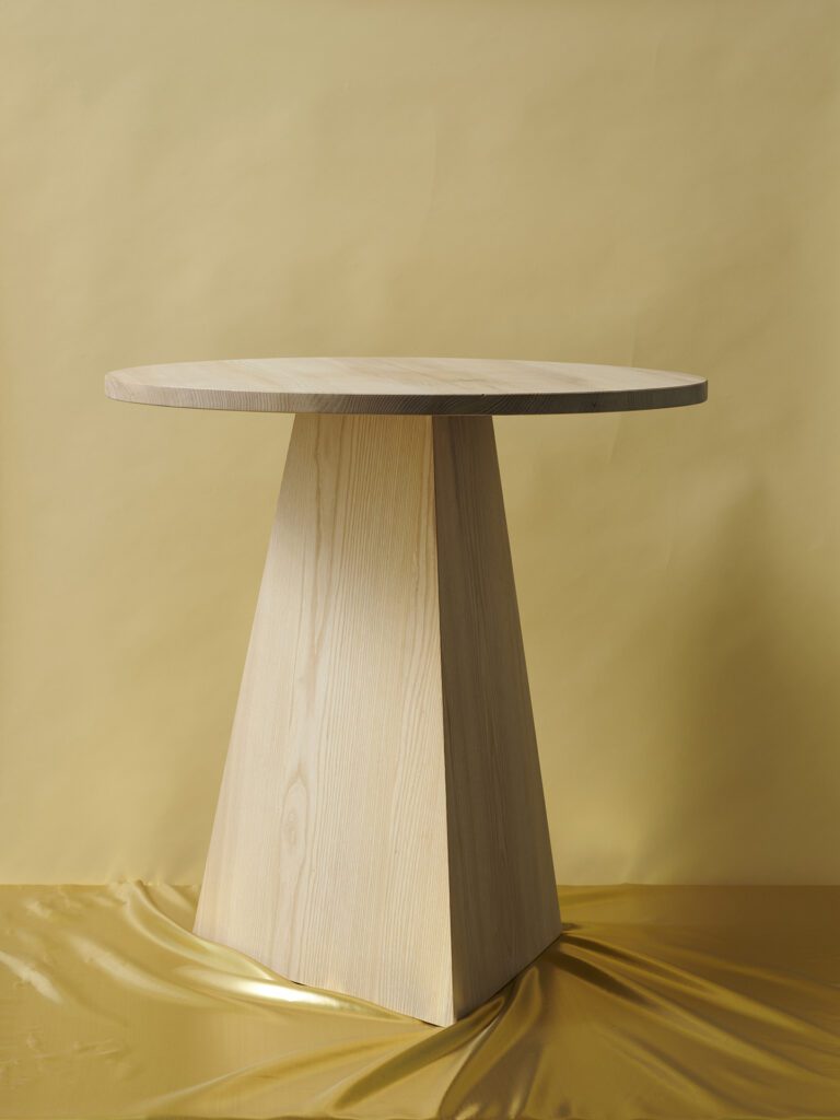Table and stool in the „Every Page“ series are made of solid ash wood and go back to an examination of the basic geometric shapes: circle and triangle or tetrahedron meet here. Depending on the viewing angle, the geometry of the objects changes. The one-sided opening allows the table and stool to be pushed into one another. The series was designed in the context of the exhibition „My Name Was Written On Every Page“ for Grimmwelt Kassel.