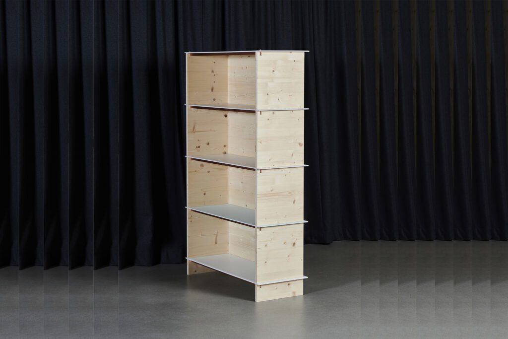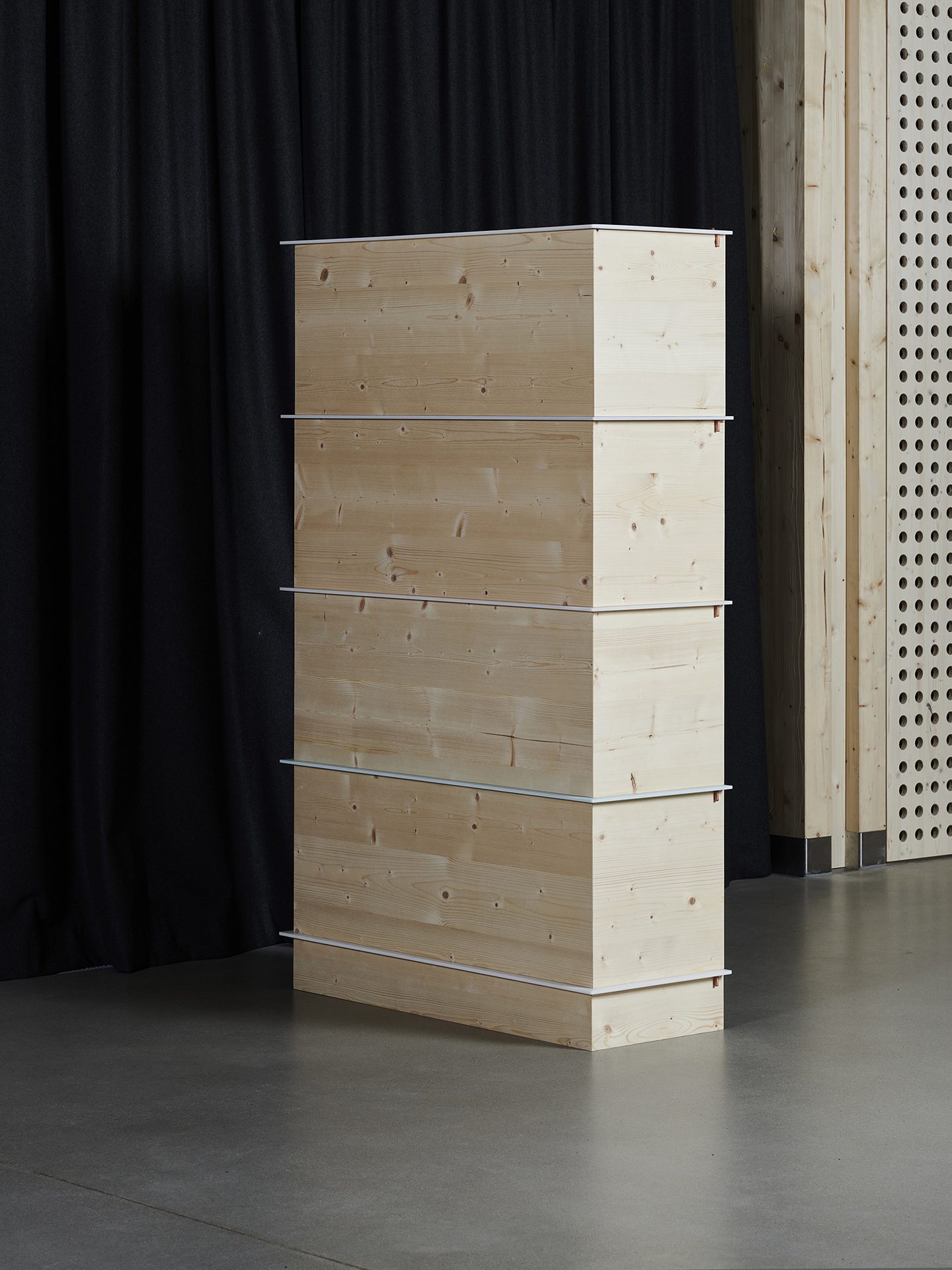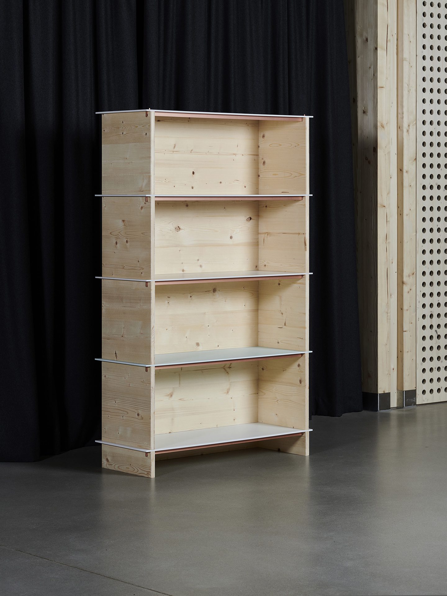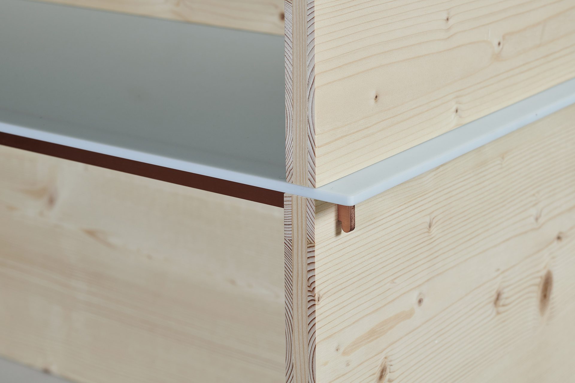 The shelf flö [sequent] applies the principle of stacking and adding in a very constructive manner: inspired by furniture and upholstery designs of the Wiener Werkstätte (Vienna’s Workshop), it consists of only three parts: a recumbent U made from wood, a copper strut, which is inserted in the front edge of the wood profile and panels, made of thin Corian in different colour nuances. Through the shape of the copper strut, the wood profile and the panels are joined and fastened. In this way, the parts can be simply stacked without a need for further fasteners. Additionally, the copper strut allows for the implementation of exceptionally thin panels. By means of stacking and the slightly varying colours of the panels, which jut out towards the side and the back, a shelf is created with a special structure from the front, the side and the back.