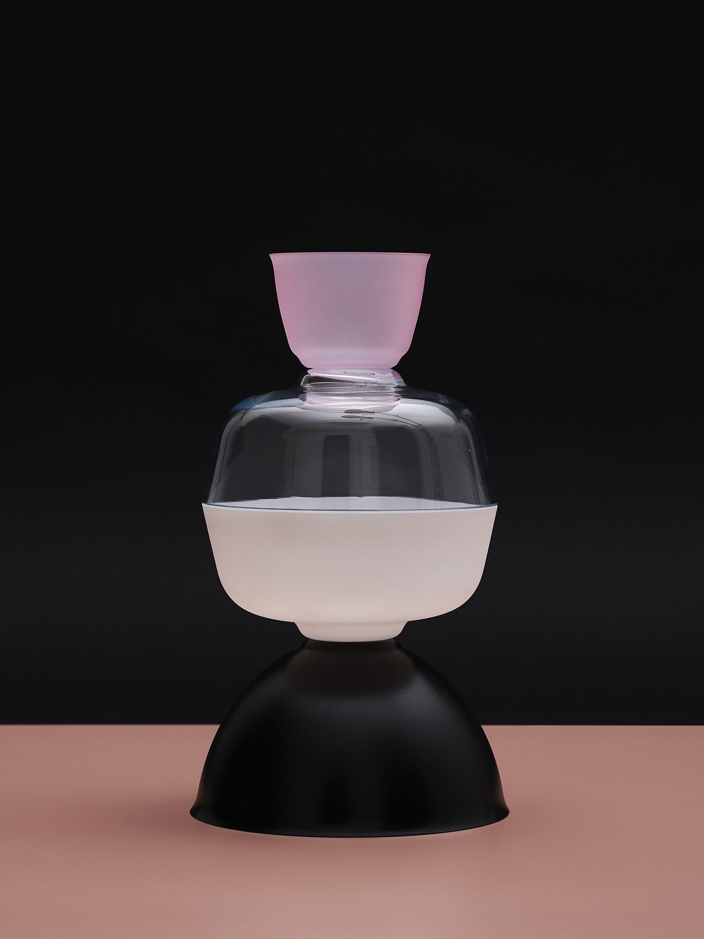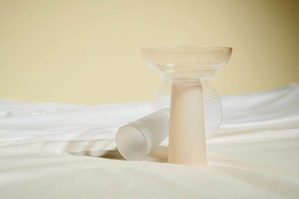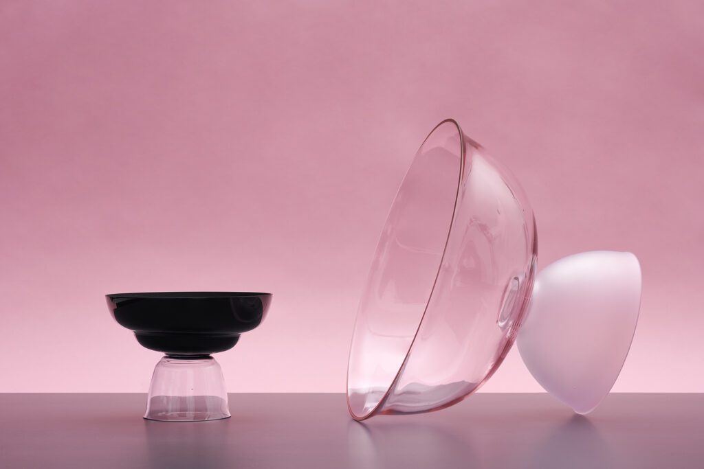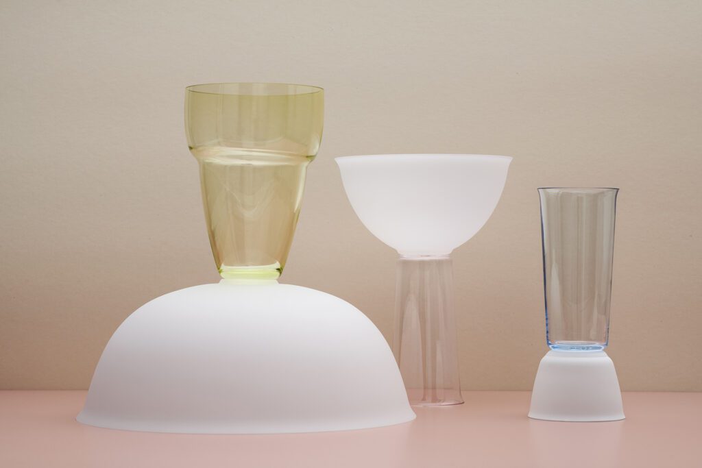 Jos [double] is a series of glass vessels for a double-sided use. The motif of the double-sided vessel can be found in the designs of the Wiener Werkstätte – particularly of Josef Hoffmann – in a repeated and varying shape. For the glass series Jos [double], this kind of adding or stacking was adapted with the help of a decommissioned private tupperware collection. Seven different individual shapes were thus created. In the next step, they were manufactured from glass and put together in the most diverse combinations. In this way, double-sidedly usable, thin-walled glass objects are created, which also evoke ambiguous associations: Josef Hoffmann meets Tupperware? The combination of frosted and shiny pieces of glass, as well as the choice of colour emphasise the oscillation of the design between these two poles.