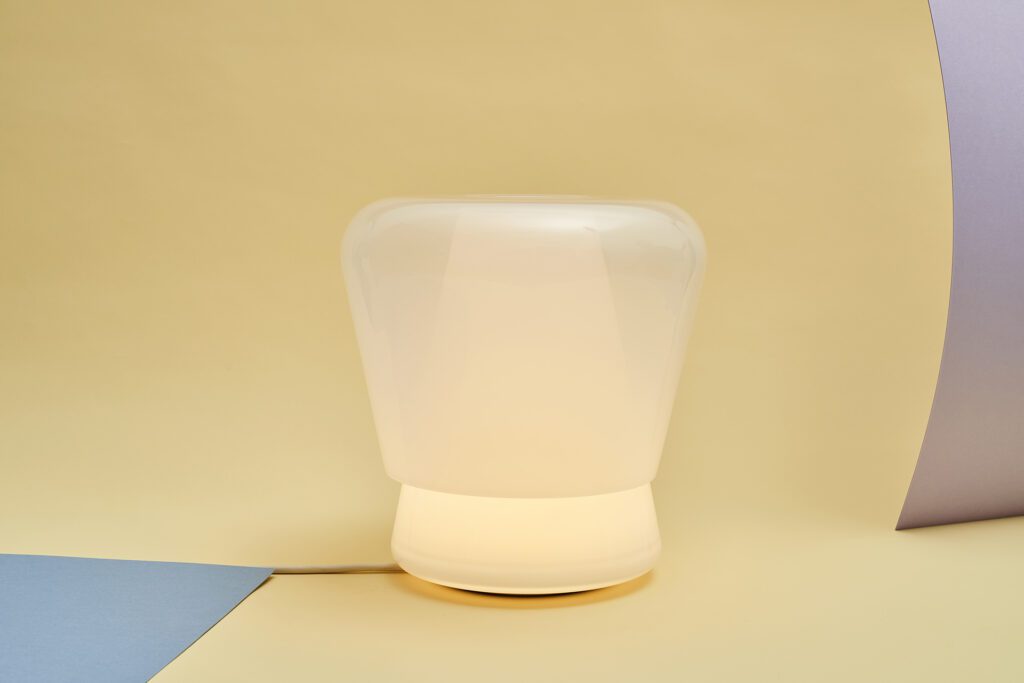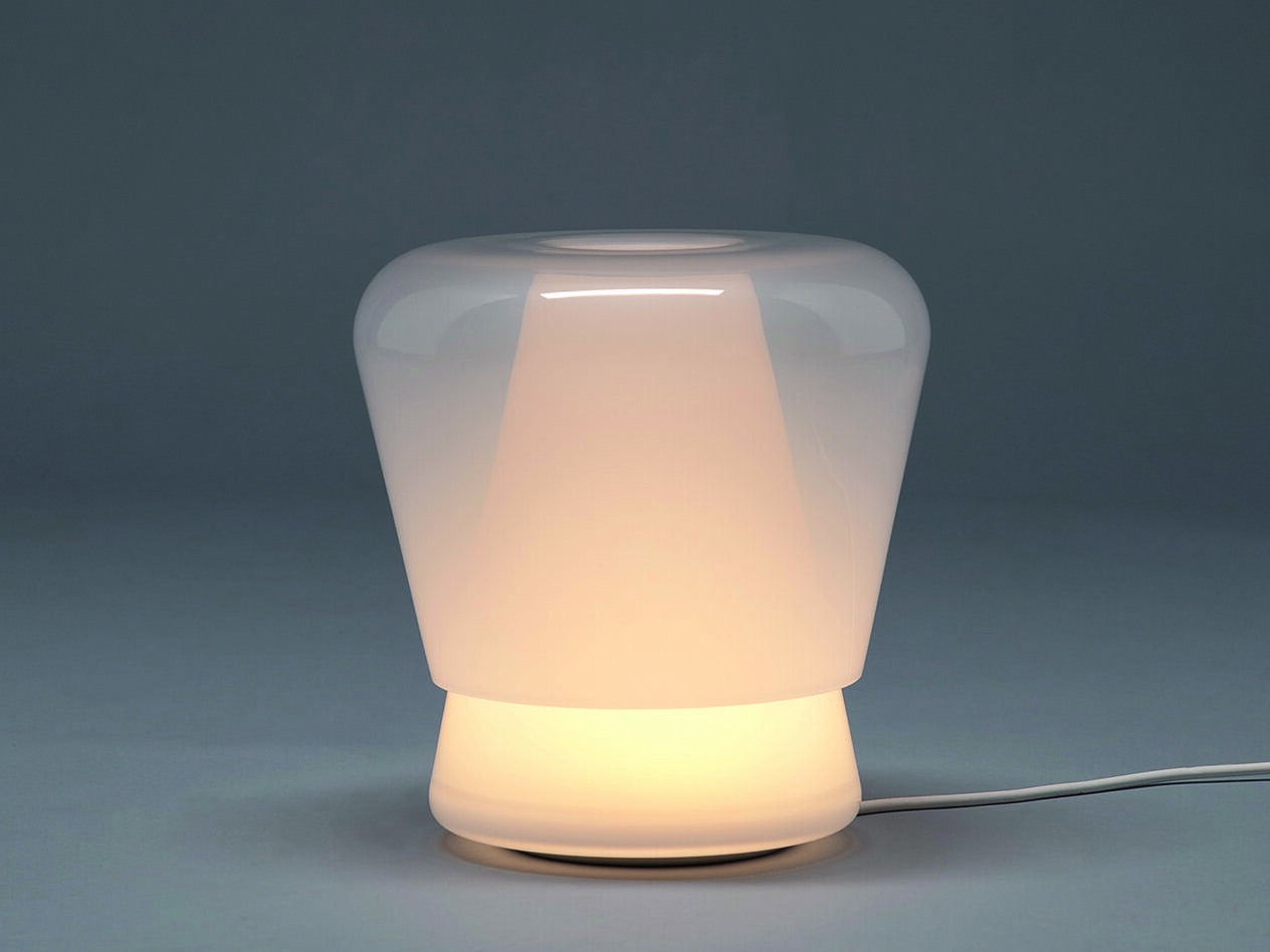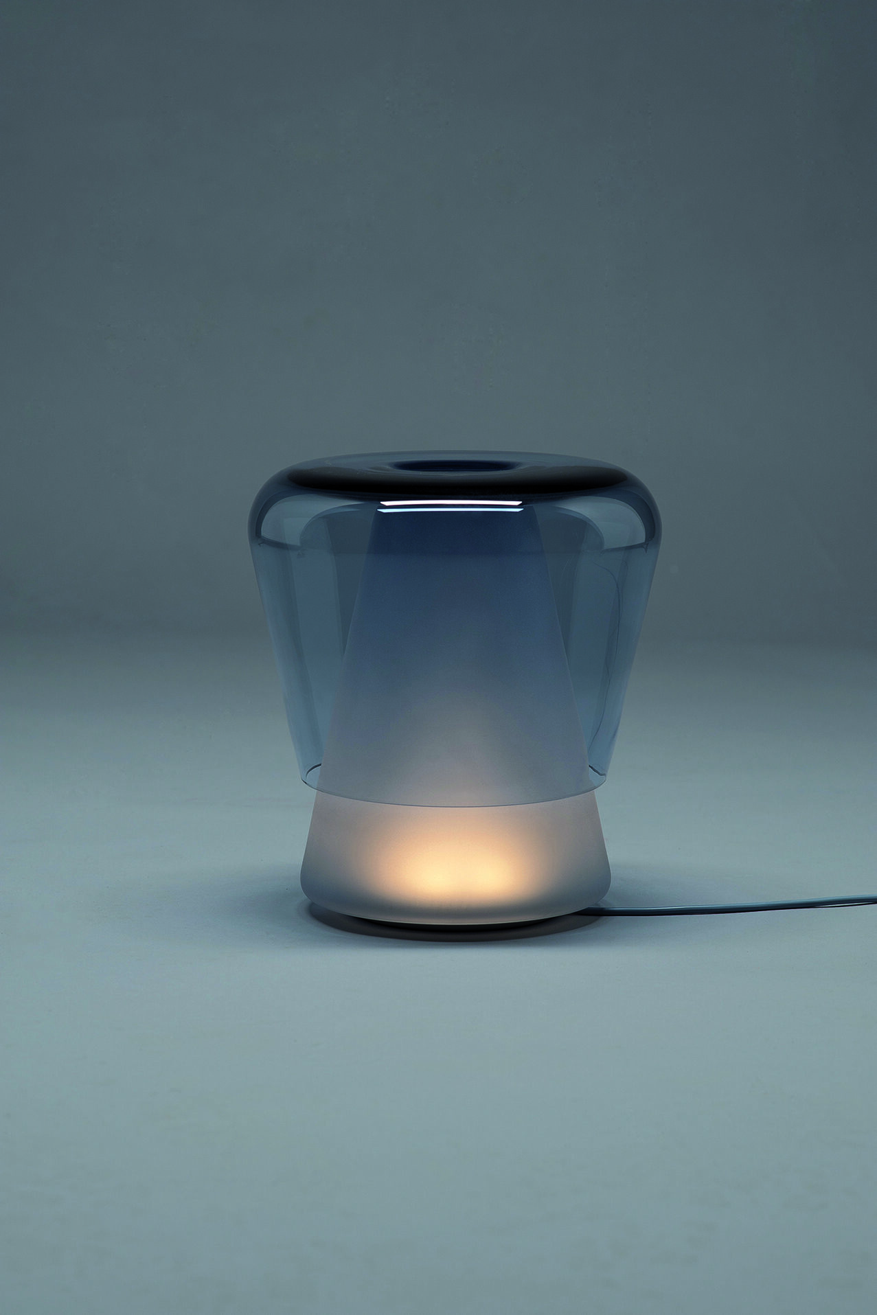 The table lamp Jumelle is inspired by the works of Wilhelm Wagenfeld and his double walled lighting designs. The design of Jumelle consists of three parts, which are only put onto another: a round bottom, incorporating the light, and two mouth blown glass bodys. The light is shining from the bottom into the double walled glasses: A spatial light body arises.