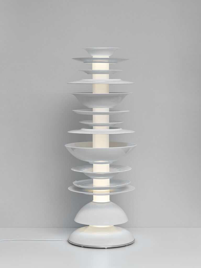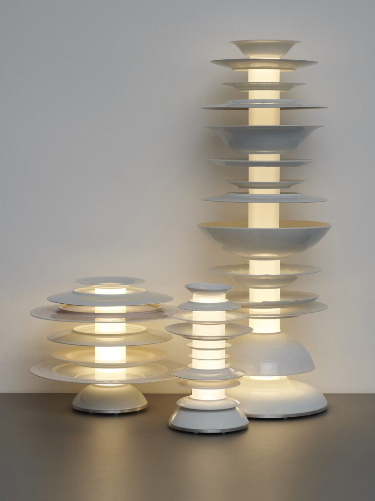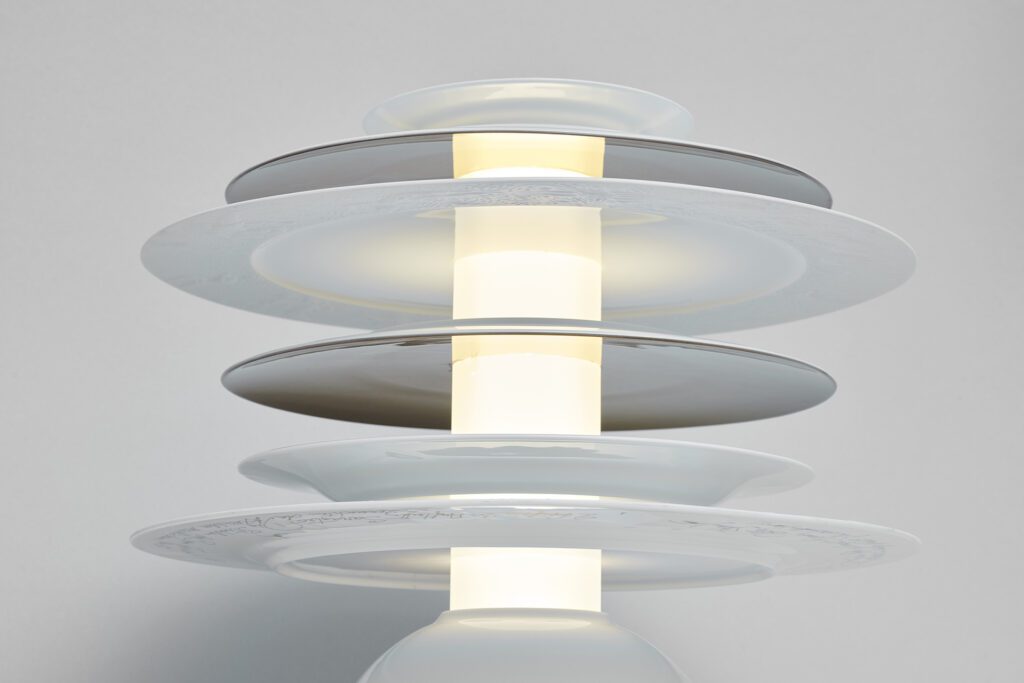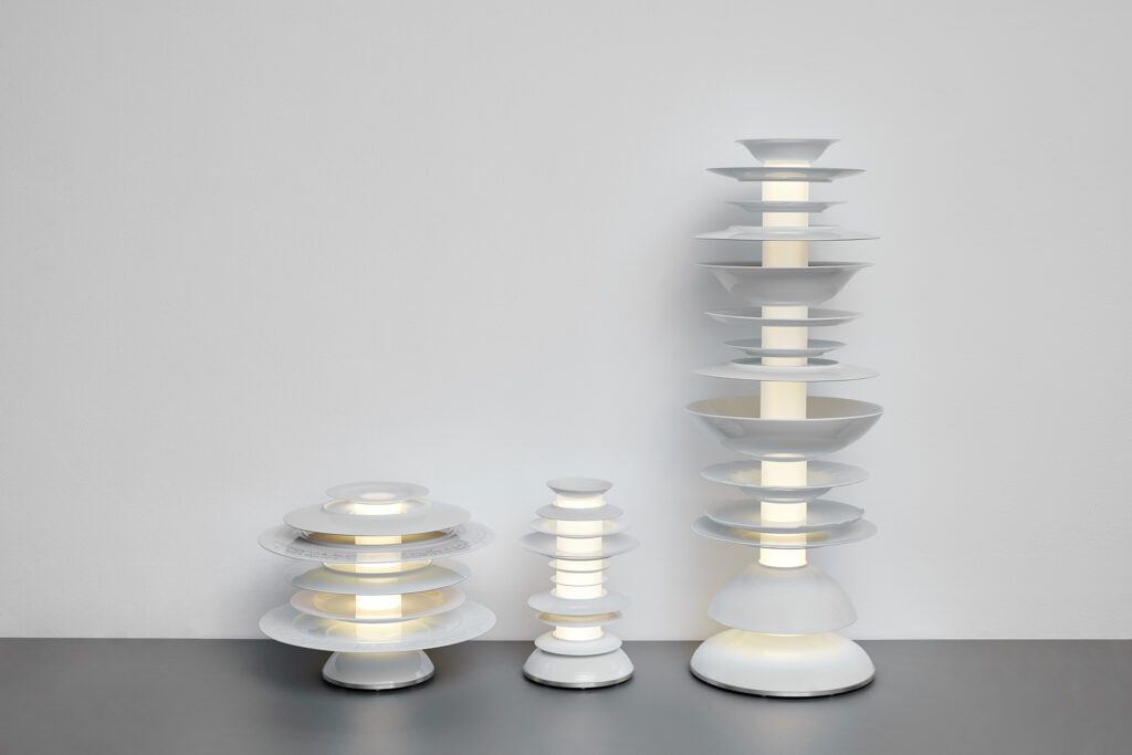 The objects (vases and lamps) of the series Pila are an unconventional assemblage of different plates from the Rosenthal Studio Line. In everyday life, plate piles are created unintentionally and for pragmatic reasons: piled for washing up in the sink or stashed in the cupboard. The design Pila demonstrates that the clash of forms, stories and time can develop a completely new aesthetic dimension: the objects allow for various designs of different designers of the Rosenthal Studio-Line to enter into a dialogue. In direct encounter they pronounce the potential of this grown collection. The individual plates become part of the whole – a new form. The perception of the singular plates changes in the overall context. Each object is unique. Each time a different selection of plates is piled in a new combination. In this way, the most different characters are created: stringent compositions, lush towers or even figurative forms. They display the range of Rosenthal’s porcelain designs: from a simple service to a gushing decor and an unconventional relief. As part of the lamps, the plates gain a new function: They are not only carrier of meaning and history: they also act as uncommon reflectors of the illuminant. The decors of the implemented plates modulate and tint the light of these light objects in soft copper and gold nuances.