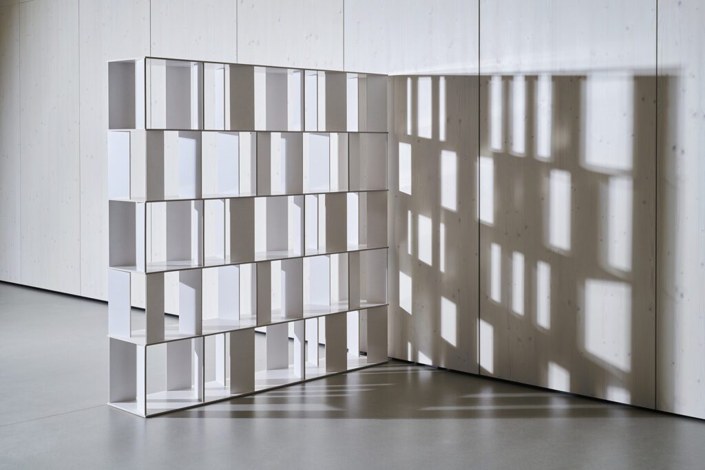 Das Regal Qudd ist inspiriert von den minimalistischen Arbeiten des Künstlers Donald Judd. Die einzelnen Elemente des Regals folgen einem strikten rhythmischen Prinzip. Aus diesem Rhythmus entfaltet sich eine starke Wirkung aus Licht und Schatten: es entsteht ein dreidimensionales Bild mit geometrischer Struktur.
