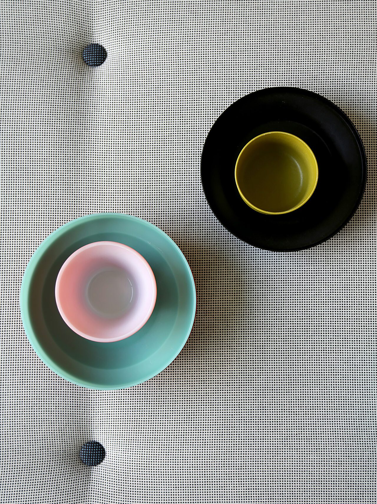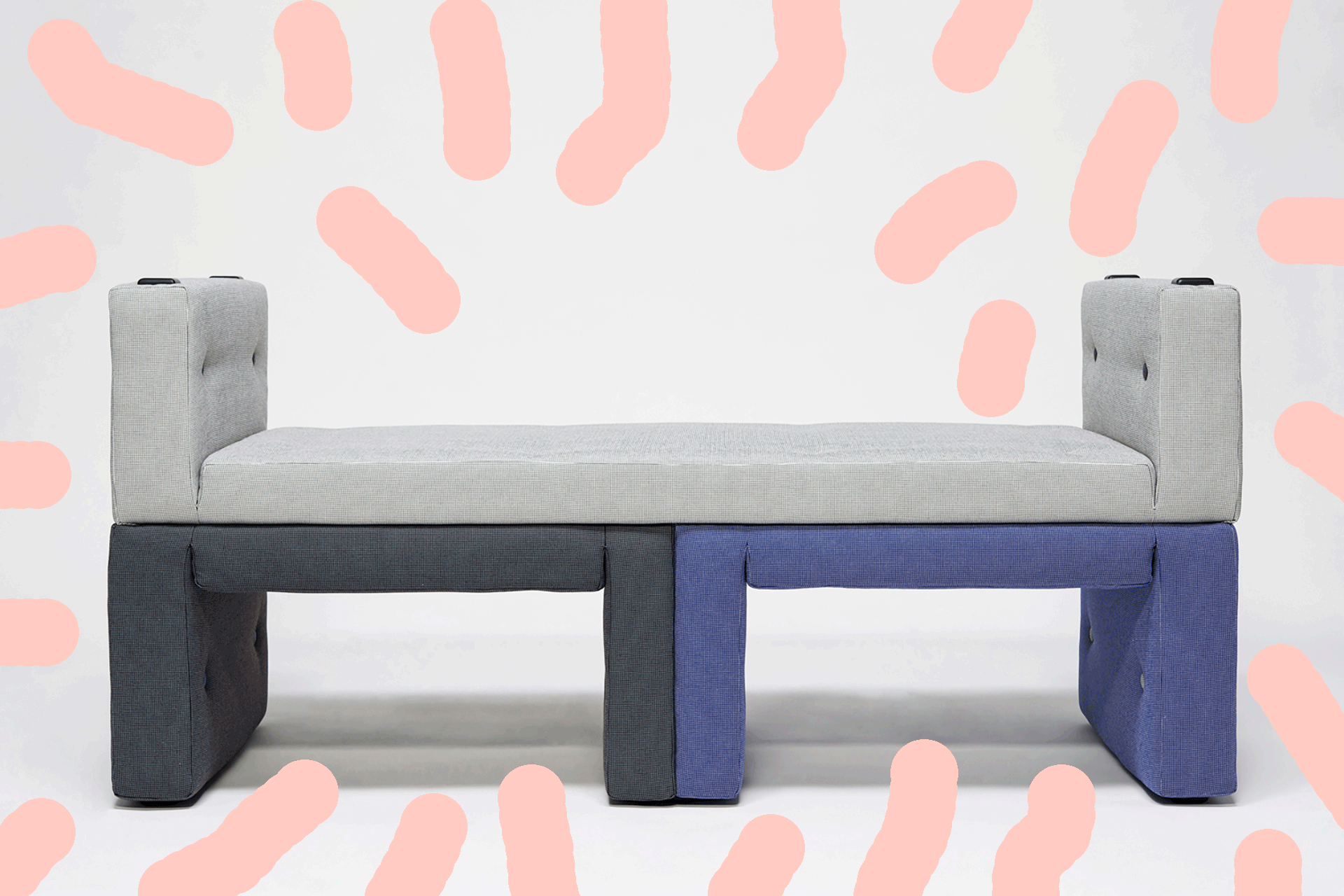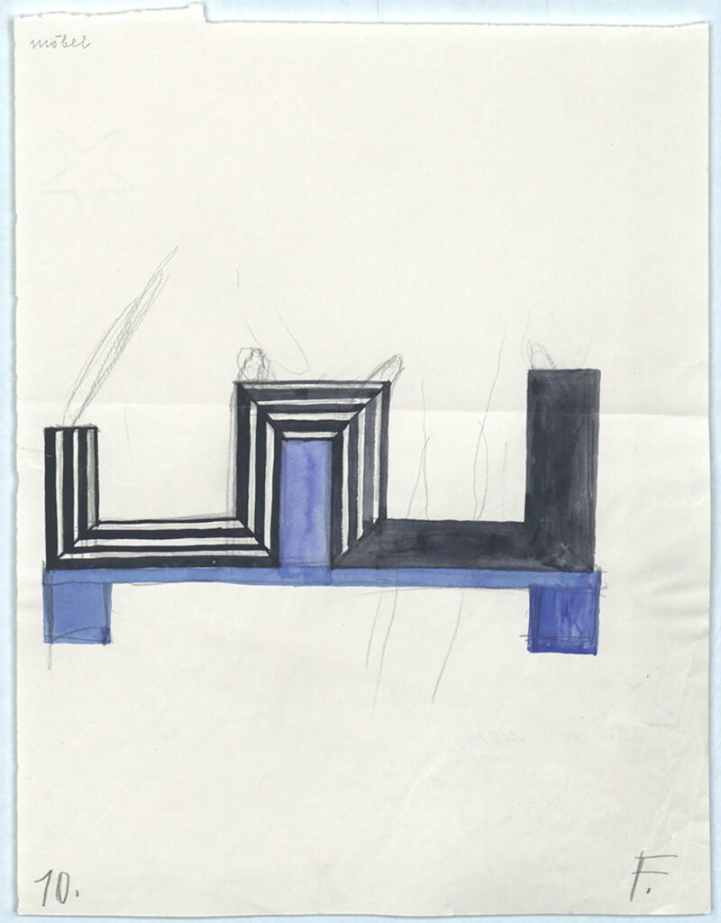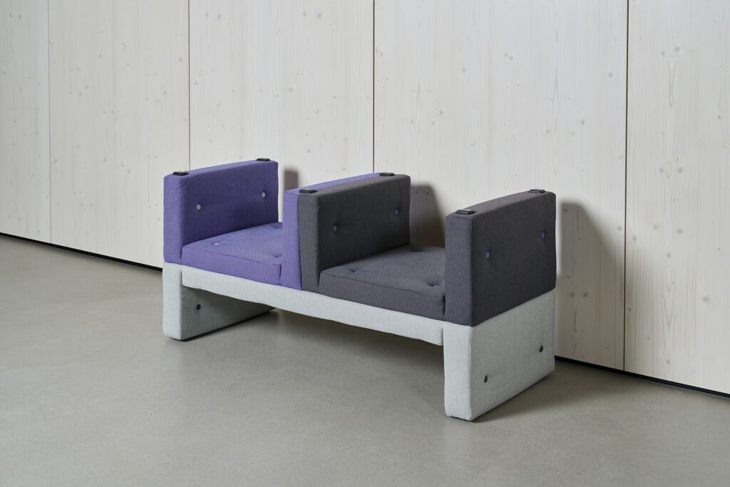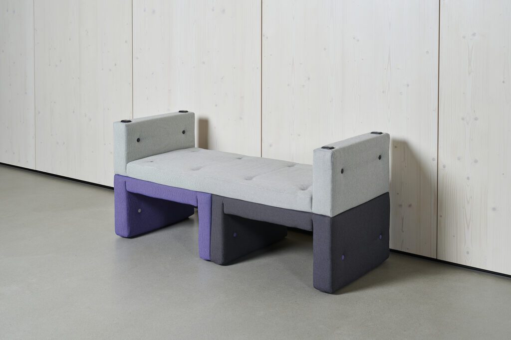 The récamière Thild [two times] is inspired by the drawings of upholstery designs by Mathilde Flögl / Wiener Werkstätte. These unusual drawings are reinterpreted and emphasized: a récamière which can be accessed from two sides, is created. It can be transformed from a single-seater into a two-seater. It can be turned upside-down and convert from an armchair into a bench. Thus, it offers the possibility of change and adaptation to the respective situation. A hybrid of upholstered furniture, a bench and a chair row. The three differently coloured upholstery textiles show the three parts, which are stacked and then joined. Additionally, the pattern of the textiles is a reference to the patterns and decors of the Wiener Werkstätte. The design was implemented with support from the Danish textile producer Kvadrat.