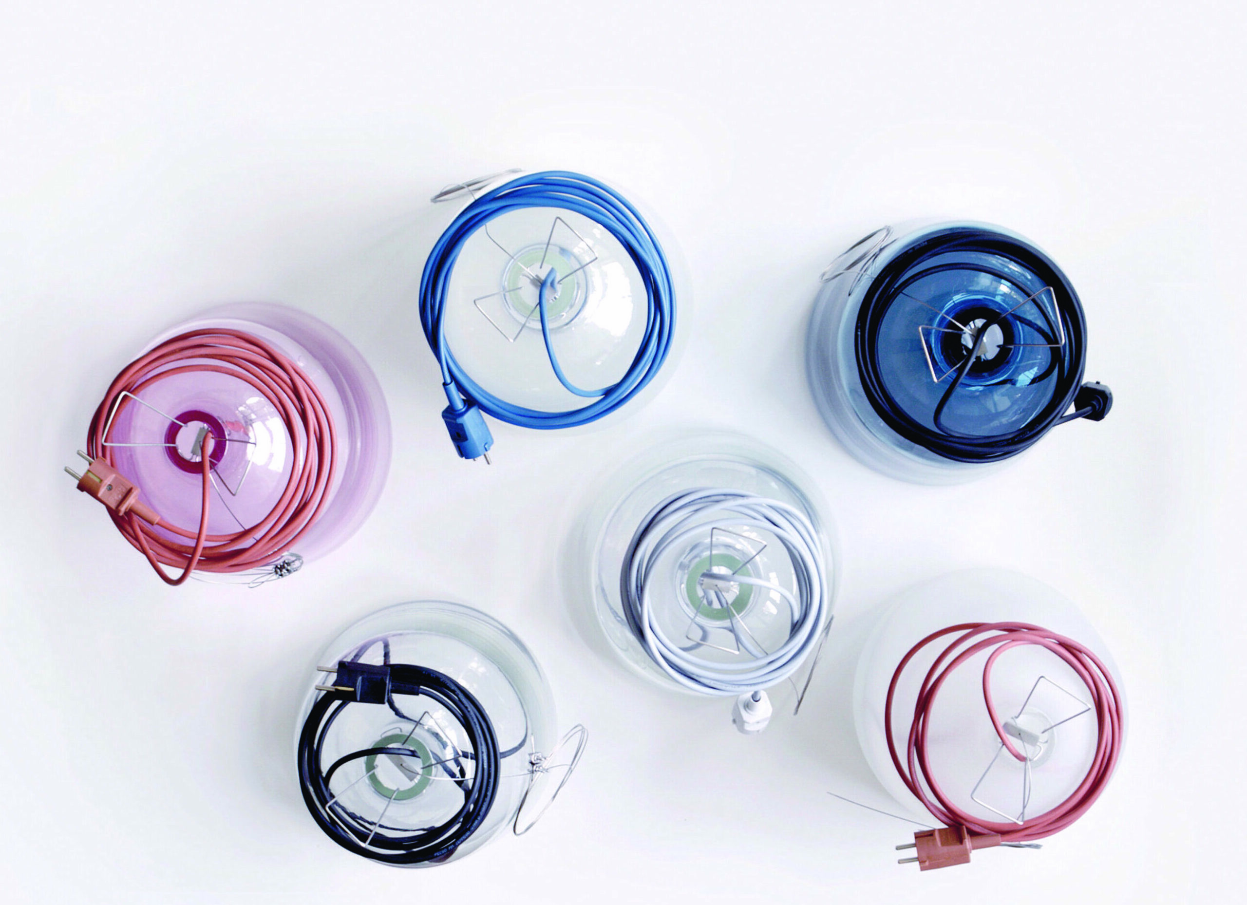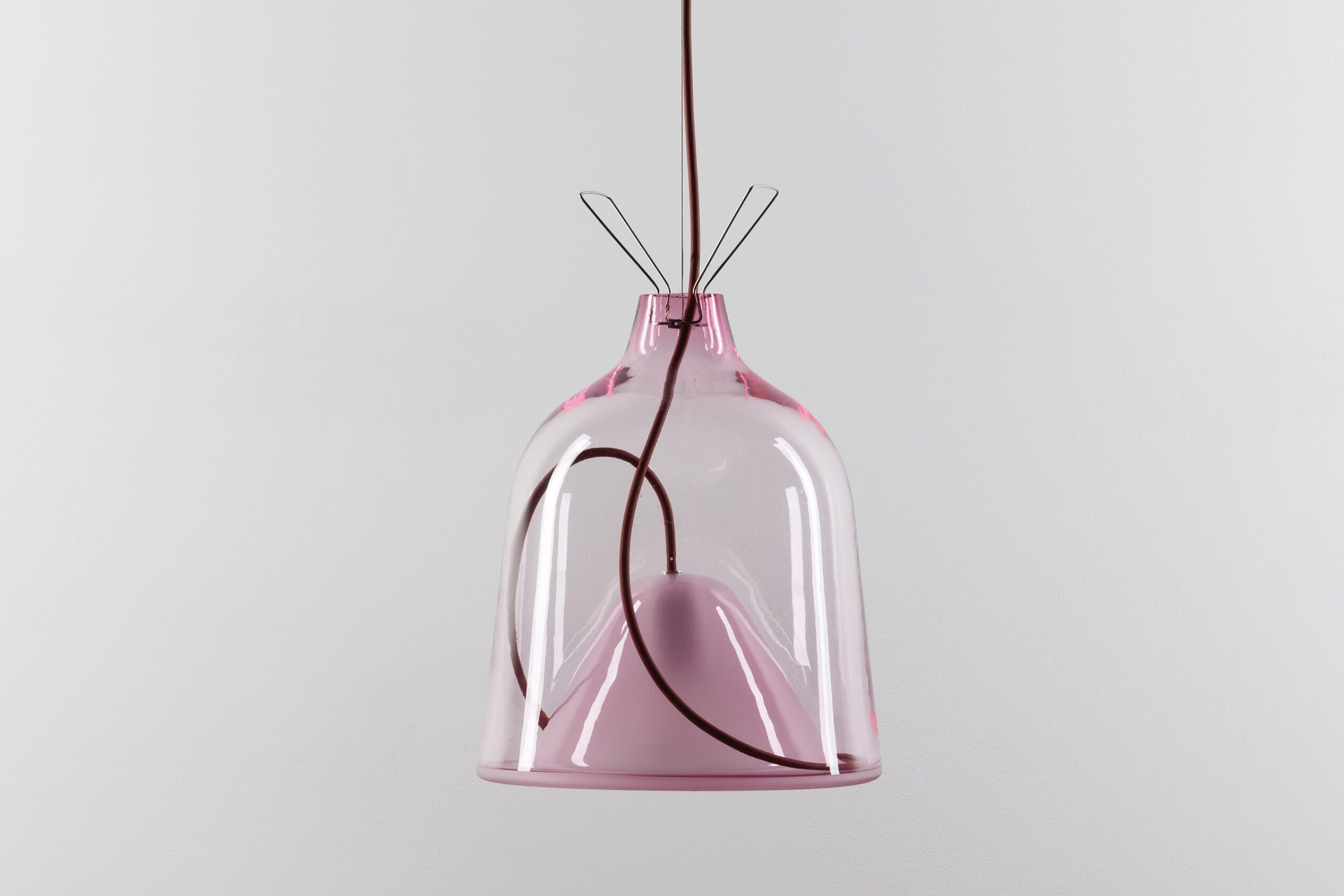 The Vaiss.eau pendant lamp borrows from the forms of historical glass bottles and receptacles. The project is concerning the relationship of traditional and manual methods of production and the design of contemporary products. The lamps particular exterior form and especially the inward curvature at the bottom resemble the shape of old glassbottles. It has a mouth-blown double-walled glass body, which combines in a single form lampshade, reflector and illuminated space. The cable is coiled inside the glass body and technical details are visible: the image alternates between luminaire and technical glass apparatus. As soon as the object is filled with light, a vitreous light container seems to arise: a luminous vessel.